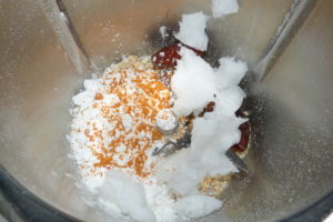 Nun füllt man die restlichen Zutaten dazu und lässt den TM noch mal für ca. 5 Sek auf St. 9 alles verrühren (sodass die Datteln auch zerhackt werden), evtl. mit dem Spatel noch mal durchrühren.