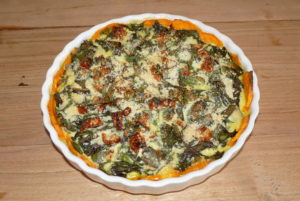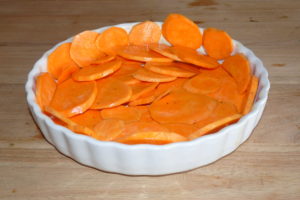 Die Süßkartoffelscheiben überlappend in eine gefettete Quicheform (24-28 cm) legen und auch noch hochkant an die Seitenwände stellen.