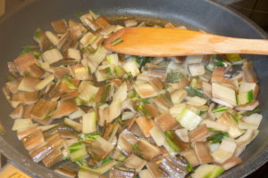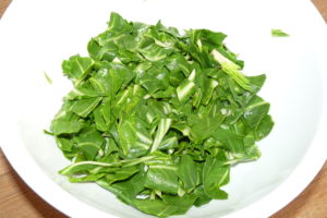 Den Mangold gründlich waschen und die Blätter von den Stängeln entfernen, alles klein schneiden und die Stängelwürfel ca. 15 Minuten in einer Pfanne mit Butterschmalz dünsten. Die Blätter so lange bei Seite legen.
