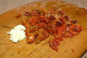 Die 4 Eier mit Salz, Pfeffer und Sahne verquirlen. Knoblauchzehe pressen und darunterrühren. Die eingelegten Tomaten in kleine Stückchen schneiden und unterheben.