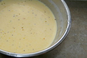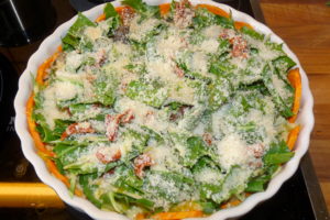 Die Eiermasse darüber geben und mit dem Ziegenkäse bestreuen. Dabei den Mangold noch ein bisschen in die Flüßigkeit drücken (damit er beim Backen nicht anbrennt, evtl. während des Backens nochmals wiederholen).